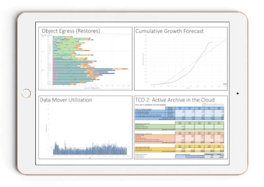 The work product is a detailed 50+ page report (mainly data visualizations) highlighting all KPIs, analysis results, growth forecasts and projections, utilization patterns, areas of concern, various TCO models, next-generation reference architectures, as well as next-generation archive recommendations and guidance. Reports and data analysis can be customized to achieve certain client objectives or answer specific operational or technical questions.